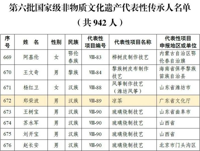 今年3月文化和旅游部公布了第六批国家级非物质文化遗产代表性传承人名单,郑荣波为该批次中唯一以“凉茶”为代表性项目的传承人。